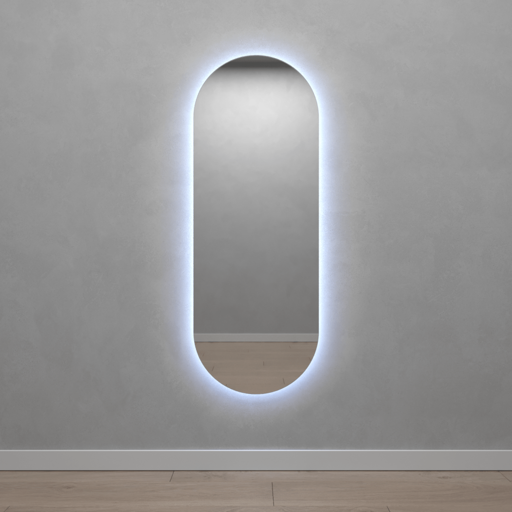 Безрамное зеркало овальной (капсульной) формы с контурной (тыльной) холодной подсветкой, свет 6000К. Подложка из высококачественного МДФ, светодиодная лента защищена матовым свето-рассеивателем от попадания пыли и влаги. Есть вывод 220W для подключения к сети, включение подсветки от выключателя на стене, либо от розетки.