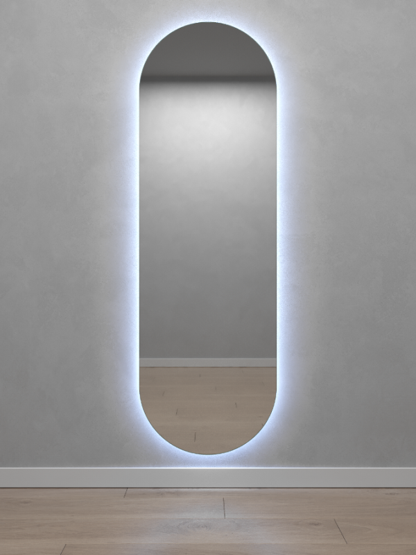 Безрамное зеркало овальной (капсульной) формы с контурной (тыльной) холодной подсветкой, свет 6000К. Подложка из высококачественного МДФ, светодиодная лента защищена матовым свето-рассеивателем от попадания пыли и влаги. Есть вывод 220W для подключения к сети, включение подсветки от выключателя на стене, либо от розетки. Возможно установить сенсорную кнопку на заказ в любом месте зеркала.